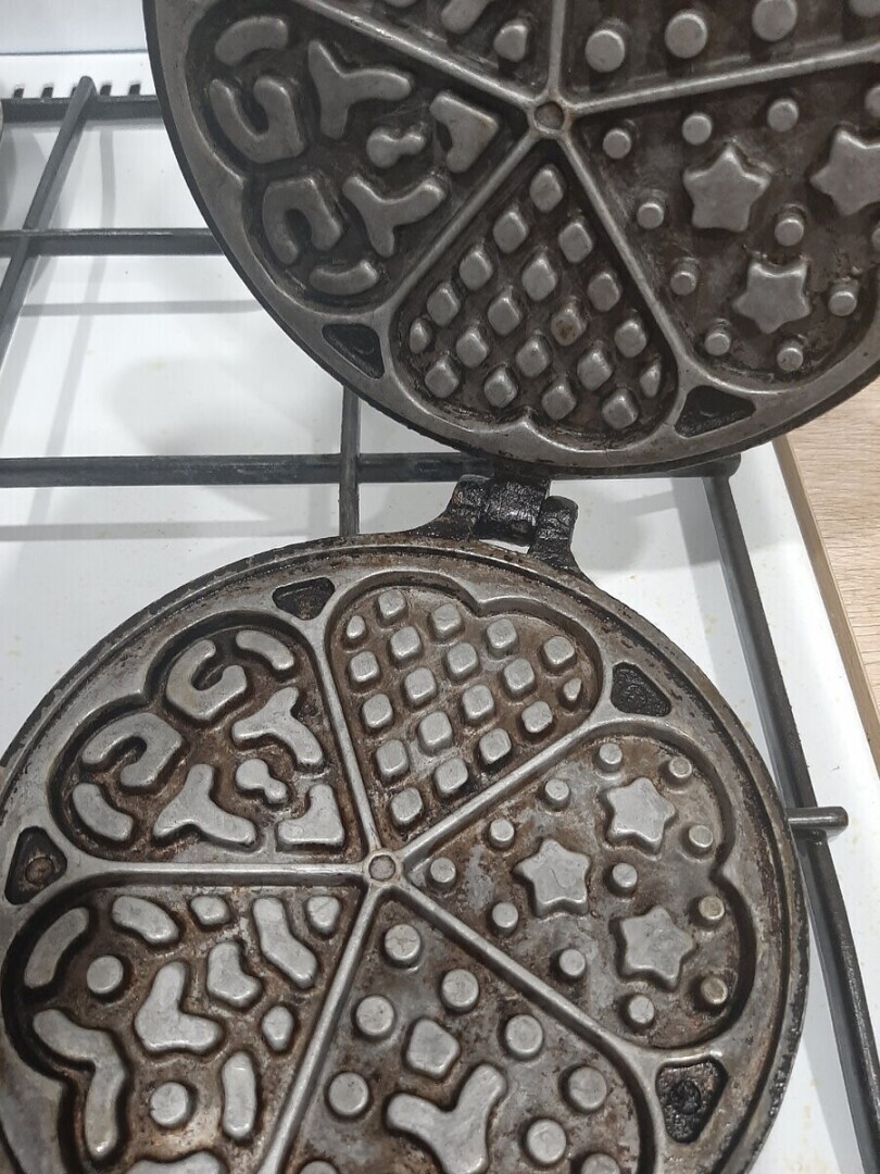 8. Вот и готово тесто для домашнего печенья. Оно не должно получиться слишком жидким, но очень густым его тоже не следует делать. Достаем форму для выпечки, смазываем совсем немножко сливочным маслом и очень сильно прокаляем форму на огне. Делается это для того, чтобы печенье не прилипало к форме. Не обращайте внимания на внешний вид формы, как-никак уже 40 с лишним лет ей))🤭🤗