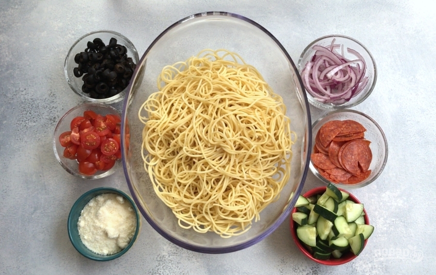 Спагетти отварить в большом количестве воды с добавлением соли. Затем слить воду, выложить обратно, добавить оливковое масло и пожеланию поперчить. Накрыть крышкой и дать остыть.