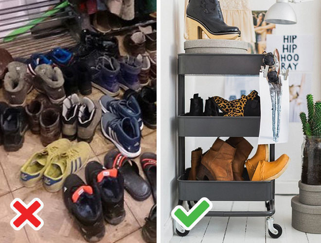 Несезонная обувь в прихожей загромождает пространство и мешает разуваться. Оставьте в прихожей только то, что вам нужно в ближайшее время. Остальное уберите в коробки или специальный комод для обуви.