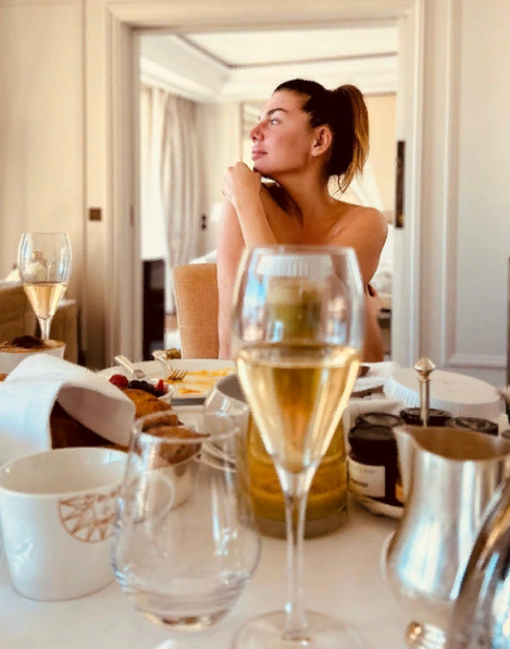 В кадре сервирован завтрак, и Анна Седокова восседает за столом в чем мать родила, слегка прикрывшись бокалом шампанского.
