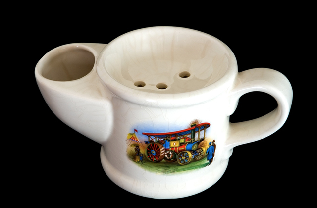 Модель, которую вы видите на иллюстрации, напоминала чайник с широким носиком. Внутрь наливалась горячая вода. Мыло помещалось на часть с отверстиями, и с помощью кисти для бритья взбивалась пена, излишки которой стекали через дырки на дно. Впрочем, некоторые кружки ничем не отличались от стандартных.