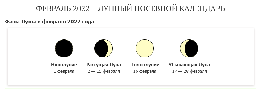 Лунный посевной календарь садоводов, огородников и цветоводов на февраль 2022 года, учитывает два основных фактора, влияющих на развитие растений: положение Луны в знаках Зодиака и фазы Луны (растущая / убывающая). Знаки Зодиака имеют большее влияние чем Фазы Луны, поэтому под плодородными знаками Скорпион, Рыбы, Телец, Рак можно смело сажать практически все растения, а вот под неплодородными Водолей, Лев, Овен не рекомендуется ничего сажать ни на растущей Луне, ни на убывающей.