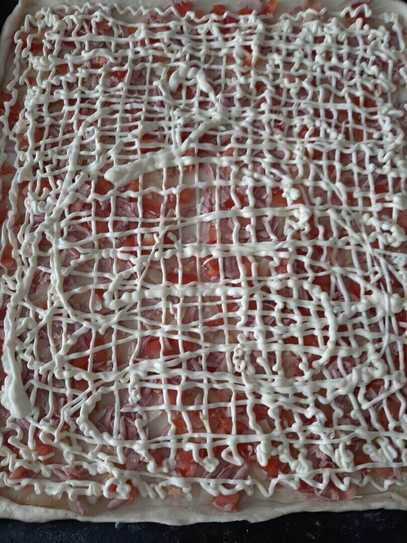Кладем нашу начинку, сверху покрываем майонезом (сеточкой).