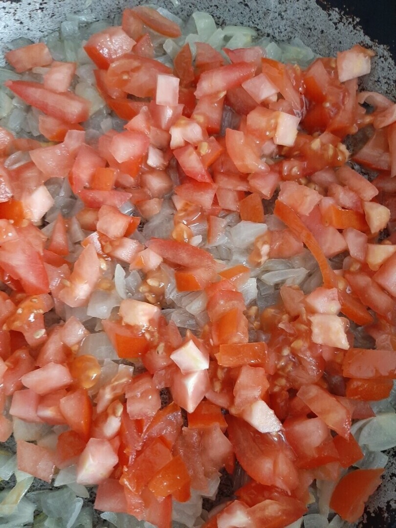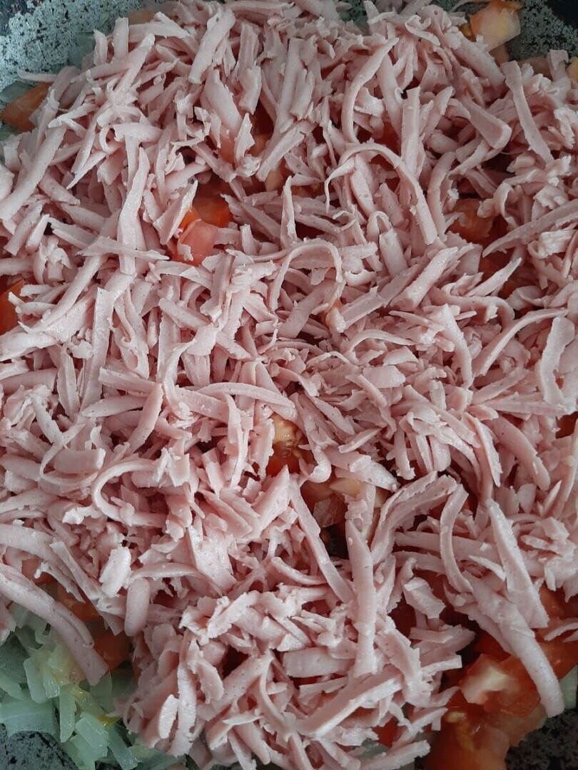 Выключаем огонь. Помидор, тоже нарезанный кубиками, и колбаса (прошедшая через крупную терку:)) также отправляются к луку. Все это вместе замешиваем.
