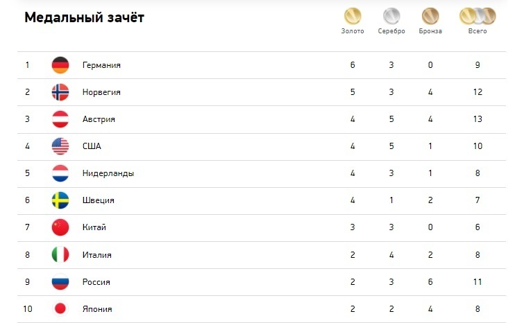 На утро 11 февраля 2022 года Россия занимает 9 место с 2 золотыми, 3 серебряными и 6 бронзовыми наградами. Всего у нас их 11. Больше только у Канады, Австрии и Норвегии.