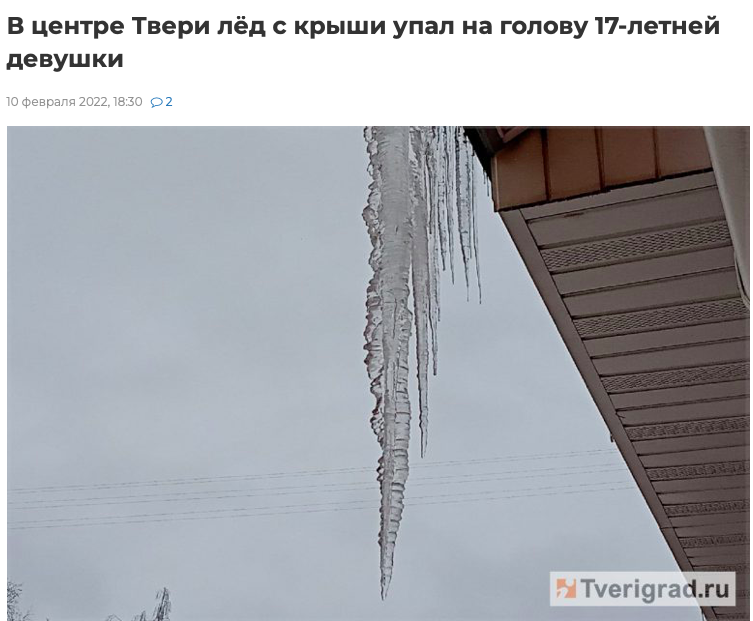 10.02.2022 была травмирована в центре Твери 17-летняя девушка, на голову которой упала глыба льда.