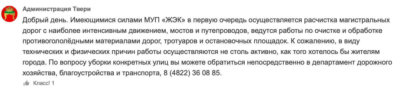 На опубликованное мною в "Одноклассниках" видео о состоянии дорог и дворов в заснеженной Твери, Администрация города дала комментарий: