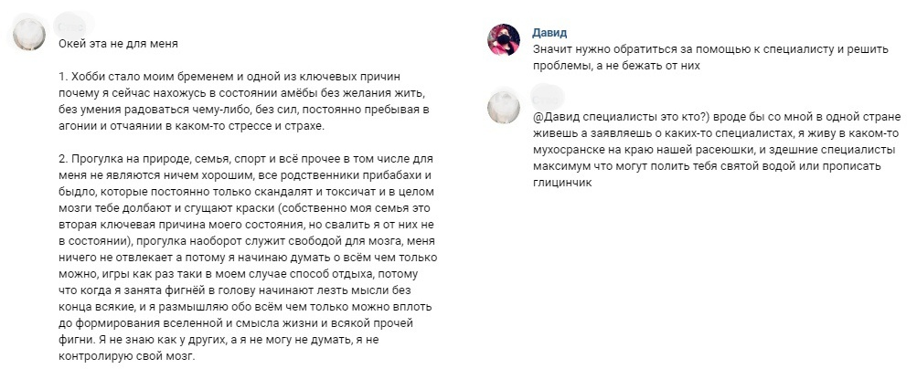 Мало людей что-то готовы менять в своей жизни и изучать что-то новое. Вот мне пишут о том, что отдыхать человек не умеет, потому что в голову лезут мысли, на что я говорю - нужно перестать бежать от своих проблем и обратиться к специалистам, ведь мозг не успокоится, пока проблемы не будут решены, на что мне отвечают "Ой, я в мухосранске живу. Кто такие специалисты? Тут нет никого".