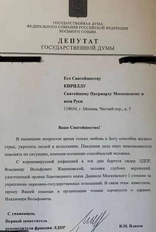 ⚡️ЛДПР направила письмо к патриарху Кириллу с просьбой помолиться за больного Жириновского