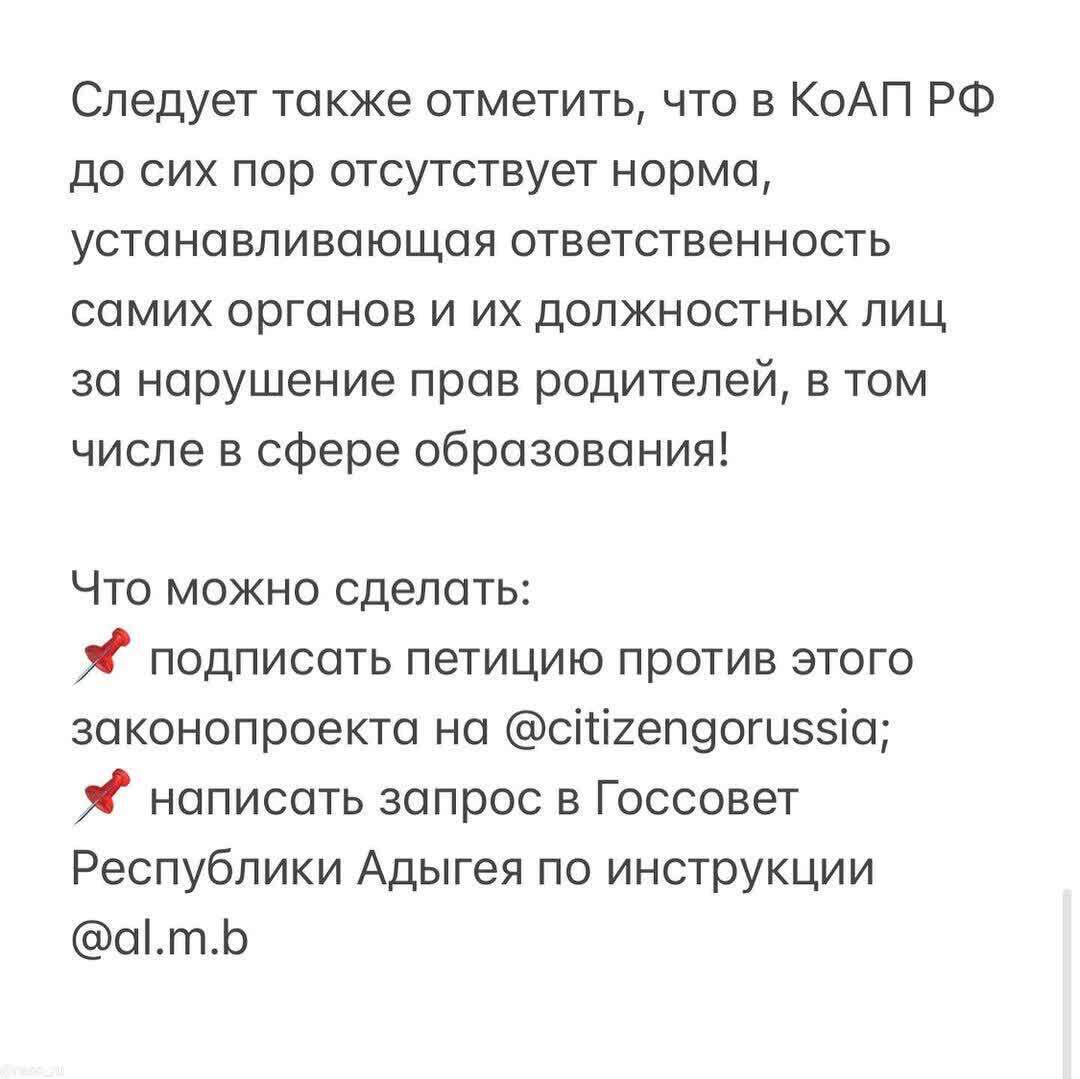 Очередная опасная законодательная инициатива: представители законодательной власти Республики Адыгея внесли в Государственную Думу РФ законопроект, предусматривающий повышение размеров административных штрафов для родителей за повторное неисполнение или ненадлежащее исполнение родительских обязанностей по ст. 5.35 Кодекса Российской Федерации об административных правонарушениях.