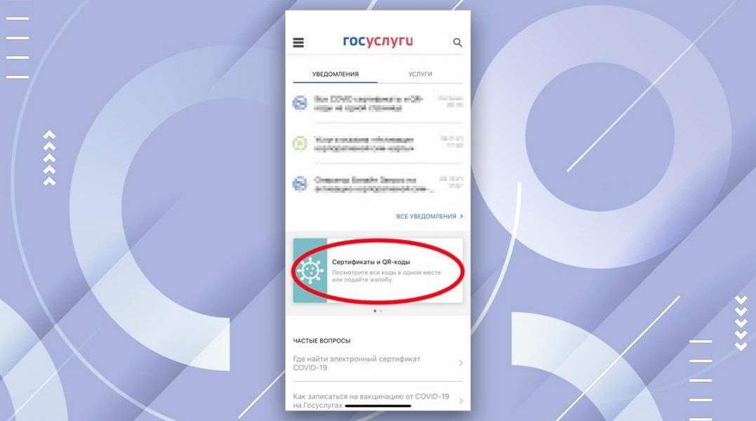 2. Найти раздел «Сведения об иммунизации COVID-19» или опуститься ниже уведомлений и нажать на баннер «Сертификаты и QR-коды»;