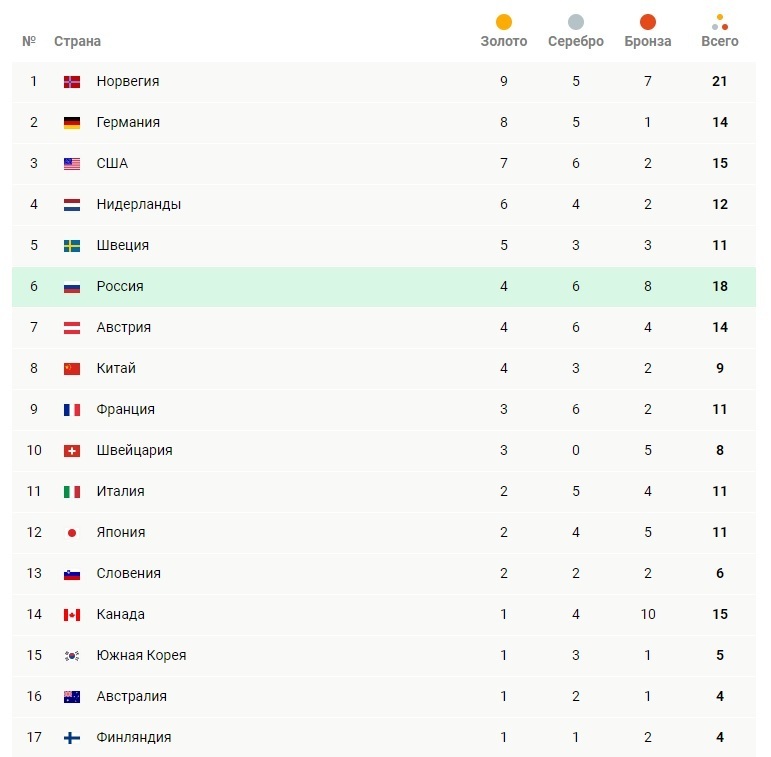 Таблица медального зачета Олимпийских игр 2022 года на сегодня - 14 февраля