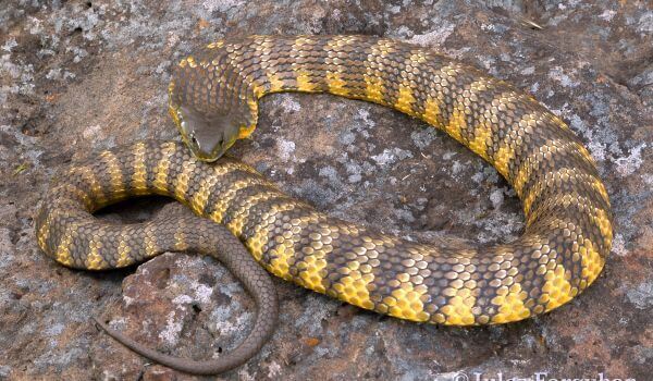 Тигровые змеи большие и очень ядовитые, с характерными черными и желтыми полосами, как у тигра.