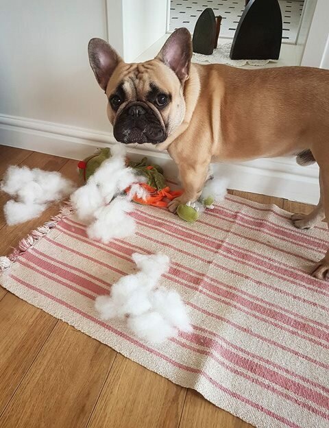 Французские бульдоги очень любят игрушки, но иногда это заканчивается изучением из чего состоит игрушка. Как и на выше фото, разобрал игрушку и виноватый вид сразу.