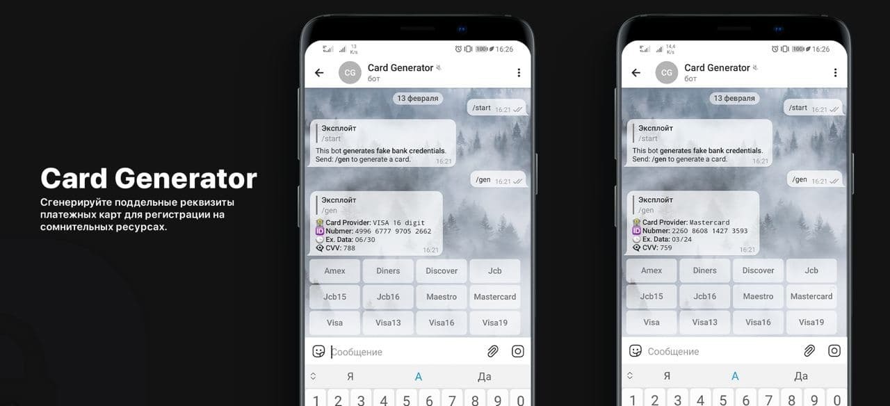 Если вы тоже переживаете, что можете забыть отменить подписку до первого платежа или же просто не хотите лишний раз «светить» свою кредитку — воспользуйтесь ботом Card Generator (https://t.me/cardgen_bot), который создаст несуществующие реквизиты банковской карты по выбранной вами одной из двенадцати платежных систем.