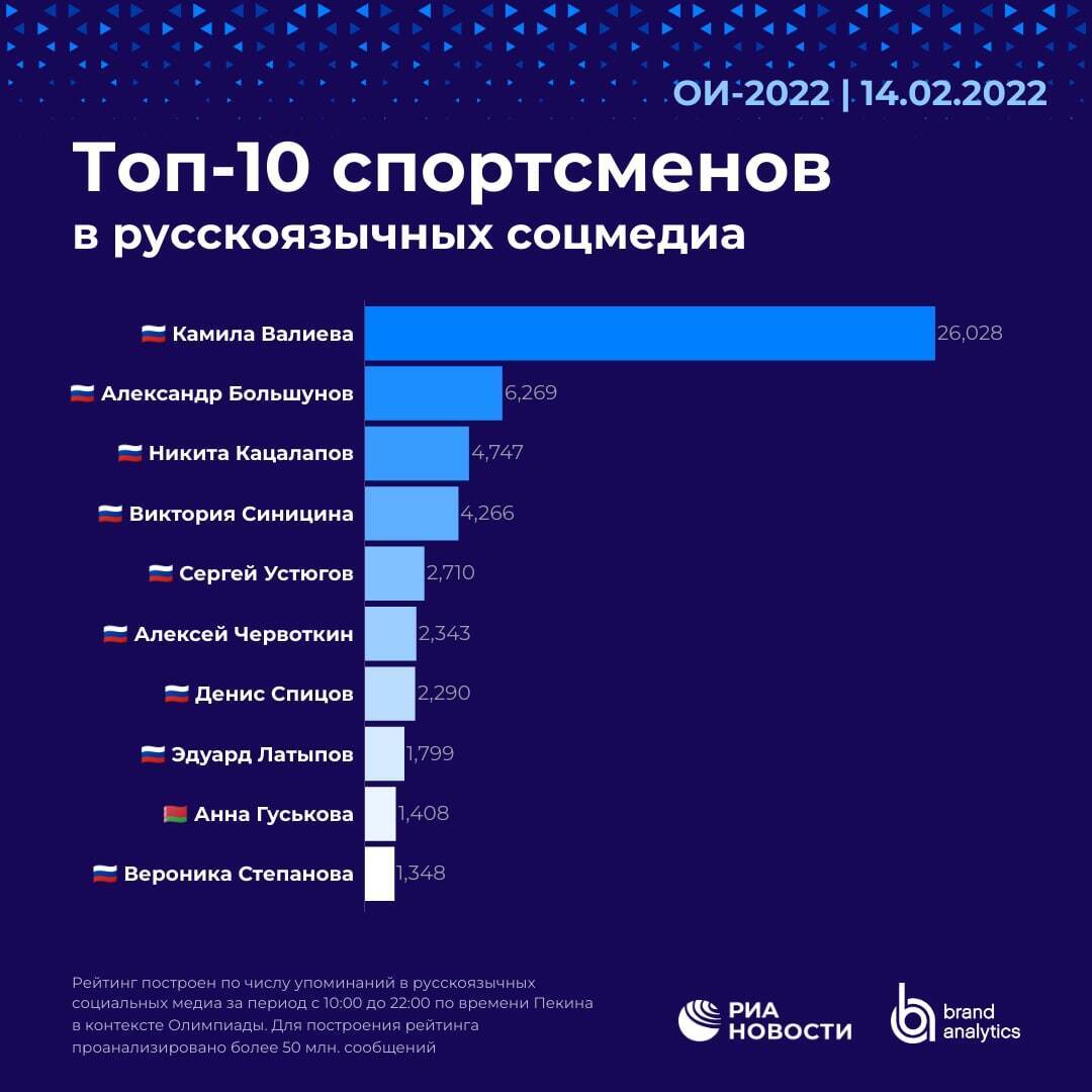 Топ-10 самых упоминаемых персон в русских соцмедиа в контексте зимней Олимпиады-2022 за прошлый денек с большим плюсом возглавила русская фигуристка Камила Валиева, юзеры в предвкушении ее концерта.