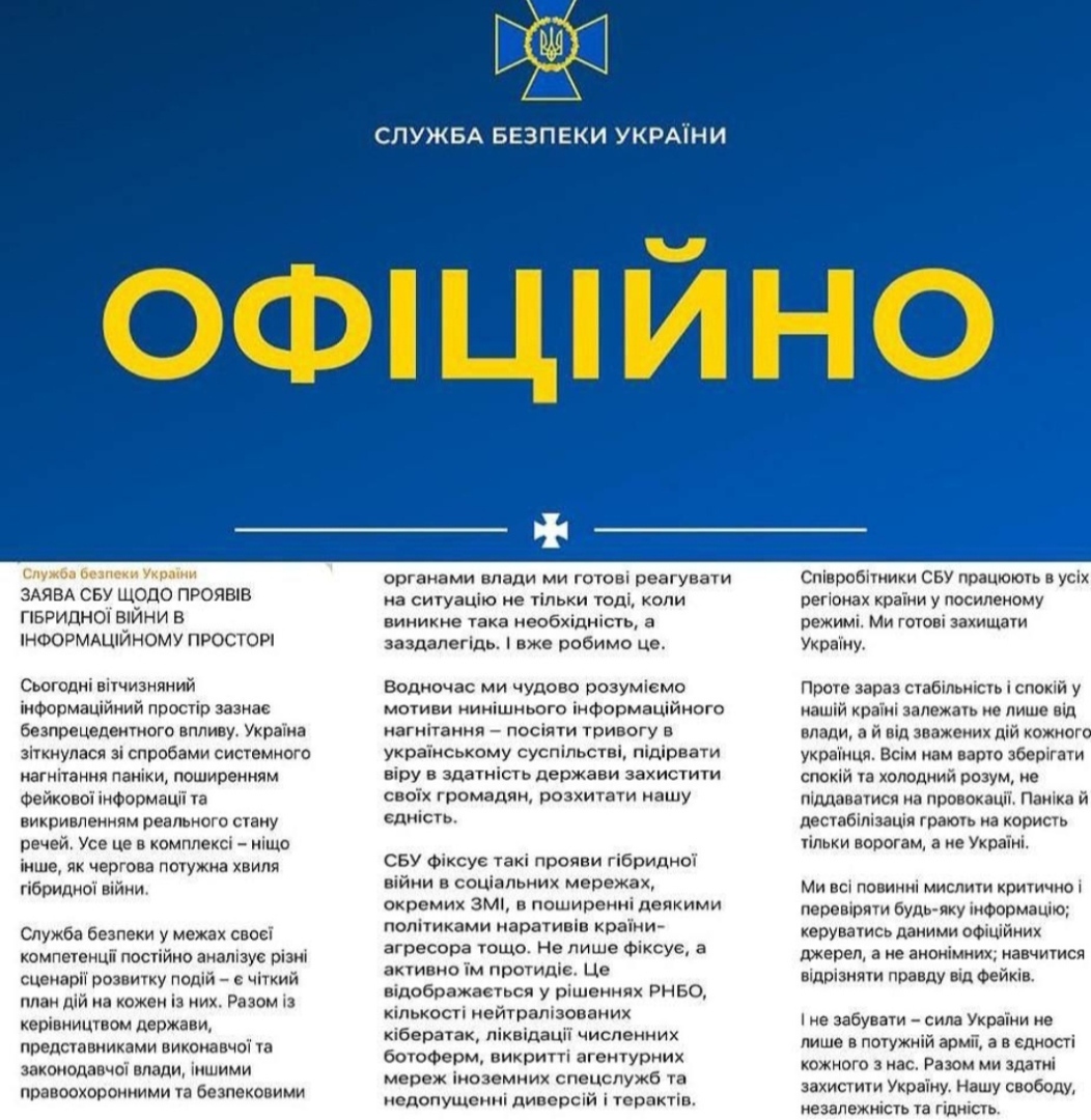 В Службе защищенности Украины сказали, собственно что государство столкнулась с беспримерными поползновениями нагнетания паники, "распространения фейков и преломления реального положения вещей".