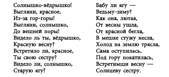 Однако Сретение у крестьян не считалось большим праздником. В народном сознании его название связывалось со встречей зимы и лета. Дети окликали солнце, чтобы быстрее взошло и принесло весну.