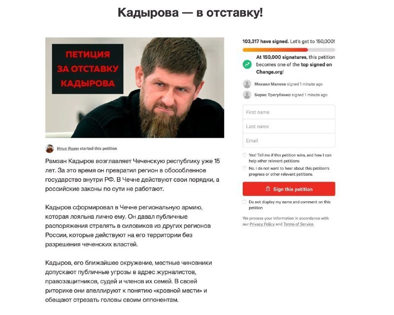 Петицию Яшина об отставке Кадырова поставили свою подпись в больше 100 тыс человек.