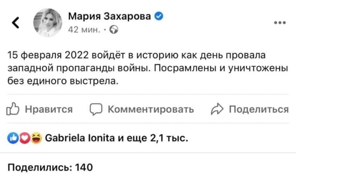 На этот раз Захарова заявила, что 15 февраля 2022 войдёт в историю как день провала западной пропаганды войны.