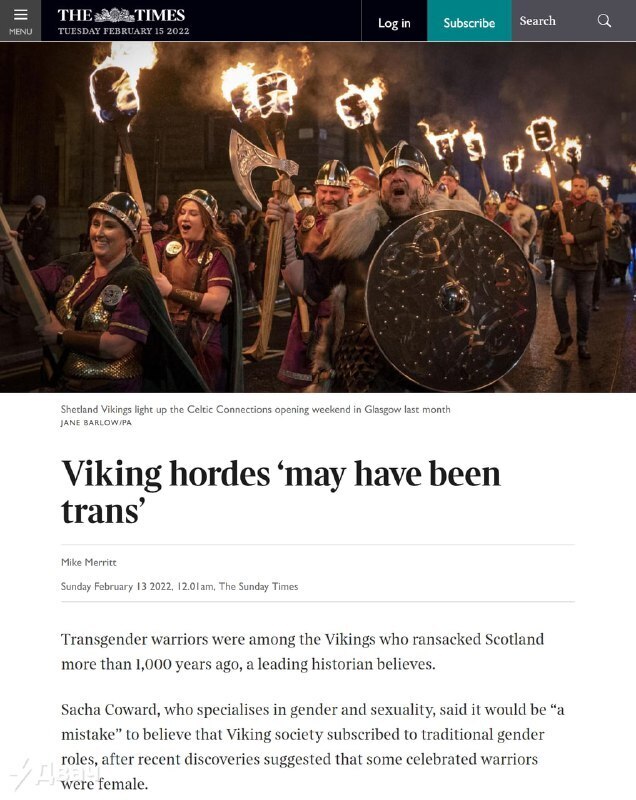 НекоторыйНекий СЖВ-активист Саша Кауард, занимающийся вопросами «гендера и сексуальности», сказал английской печатном издании The Times, собственно что викинги, живущие больше 1000 лет обратно, имели возможность быть трансгендерами. По его текстам, неверно думать, собственно что разговор викингов держалось классических гендерных ролей. Из пруфов у него то, собственно что археологи находили остатки «женщин-воинов» с зажатыми в руке ключами. Как раз они по его воззрению и были трансгендерами. На самом деле они были элементарно женщинами-воинами, а активисту пора в дурку