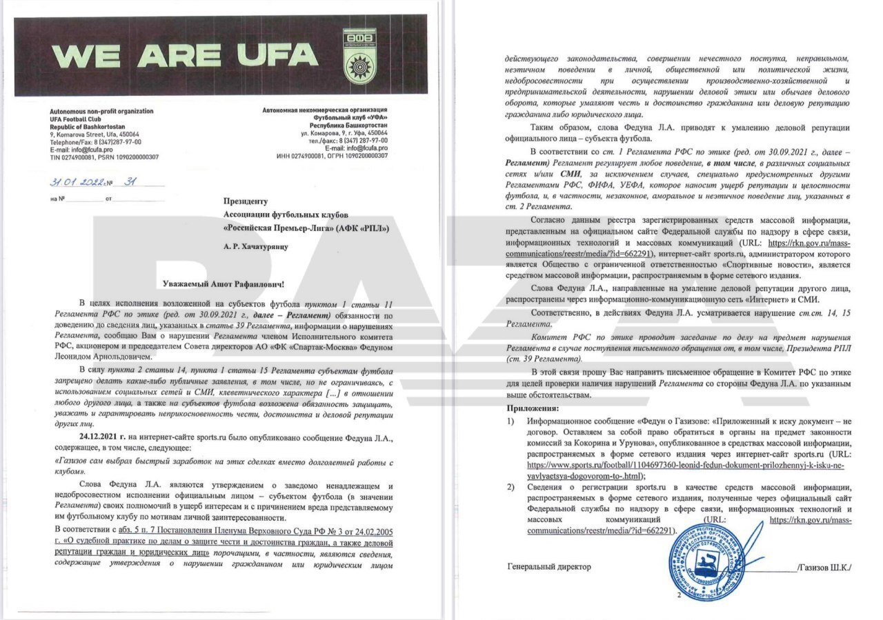 Газизов счел, собственно что эти текста президента «Спартака» умалили его бизнес репутацию. А например как они были высказаны в СМИ, то, по воззрению Газизова, Федун не соблюл регламент РФС по этике — а это означает, его надо когда-то наказать.