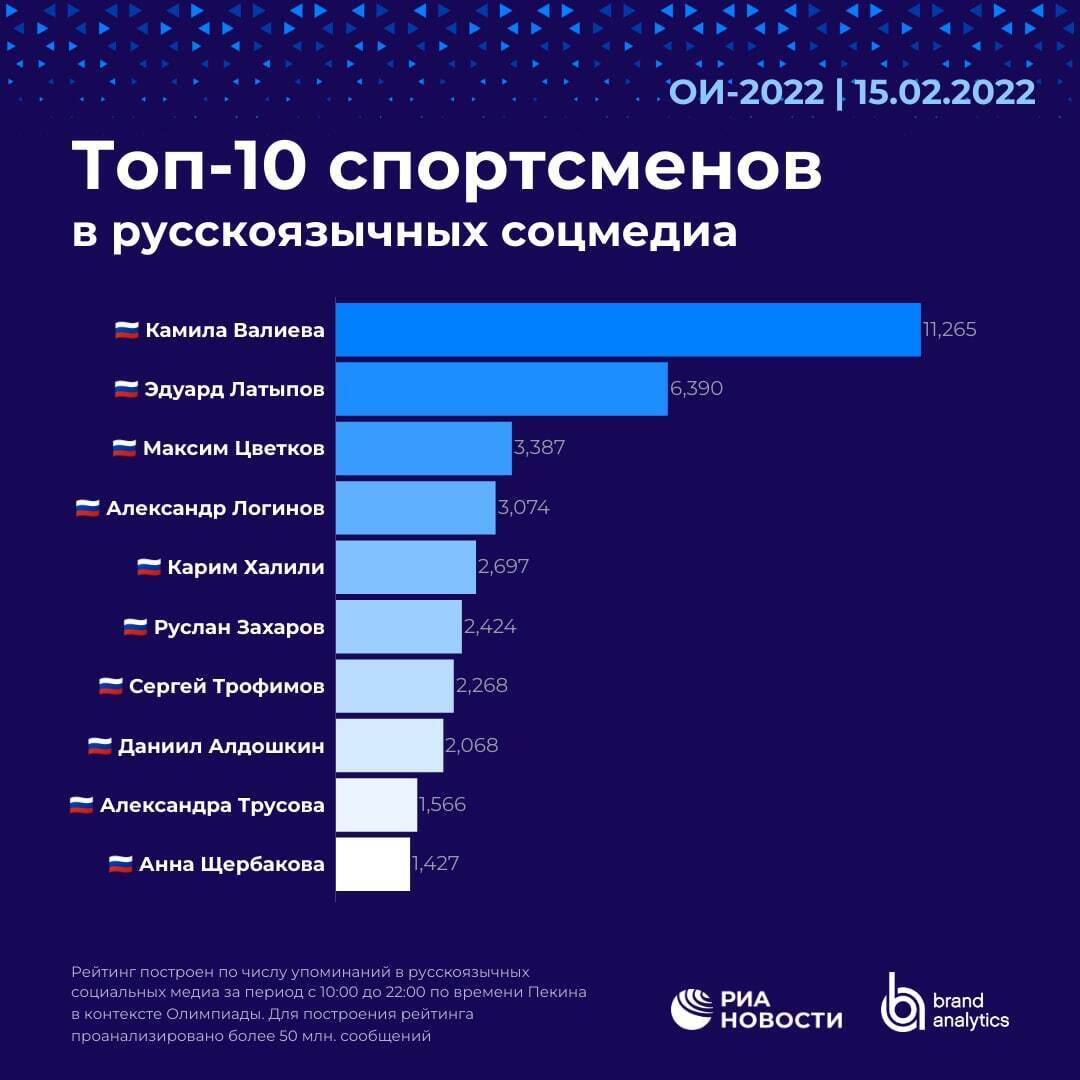 Российская фигуристка Камила Валиева возглавила рейтинг самых упоминаемых спортсменов в англоязычных соцмедиа в связи с Олимпиадой в Пекине за минувший день, вытеснив с первого места японского фигуриста Юдзуру Ханю, свидетельствует исследование, проведенное в рамках совместного проекта РИА Новости и Brand Analytics, посвященного пекинской Олимпиаде