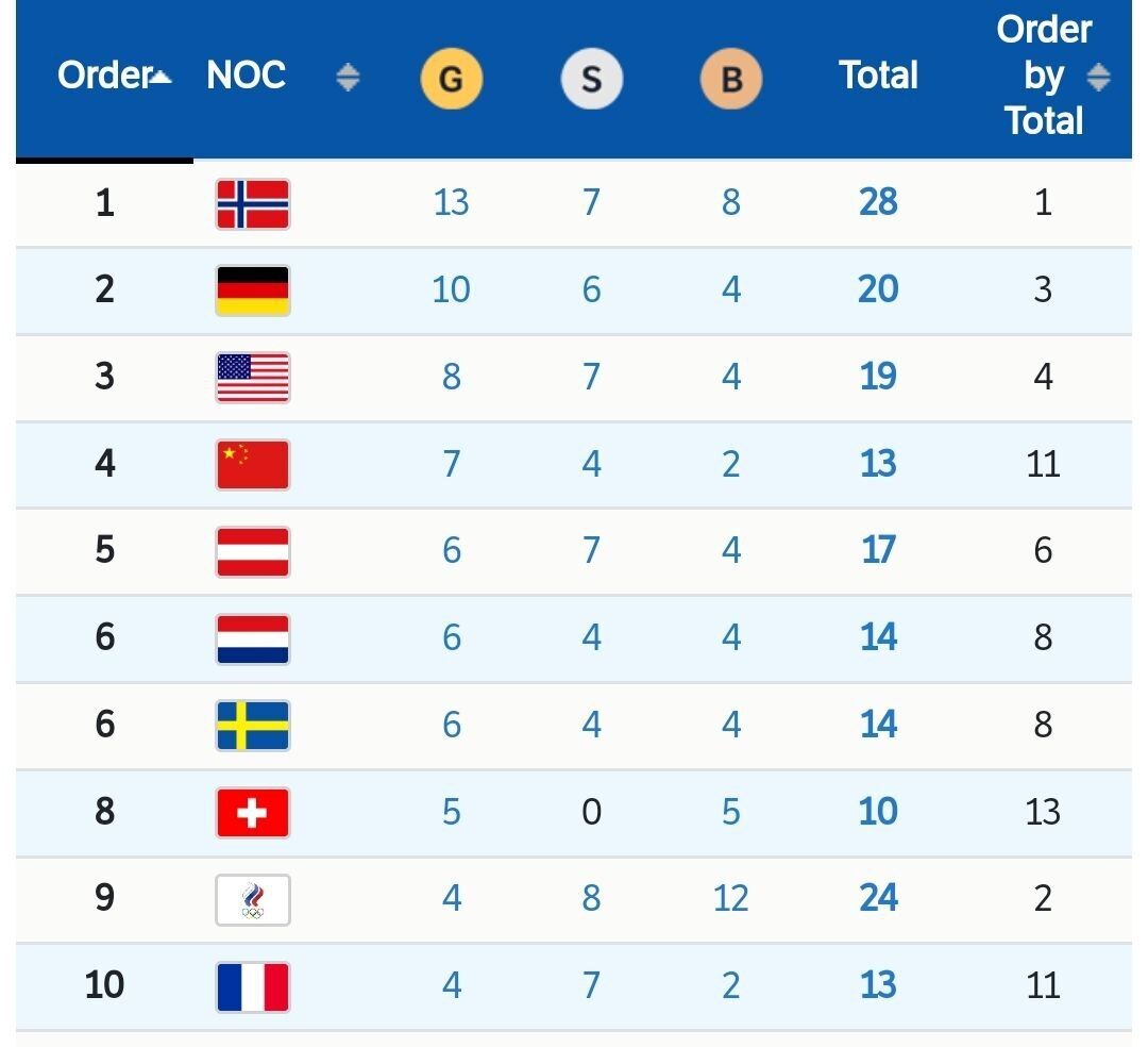 По числу золотых медалей лидирует сборная Норвегии (13). Она же занимает первое место по всеобщему количеству наград (28), россияне - вторые (24).