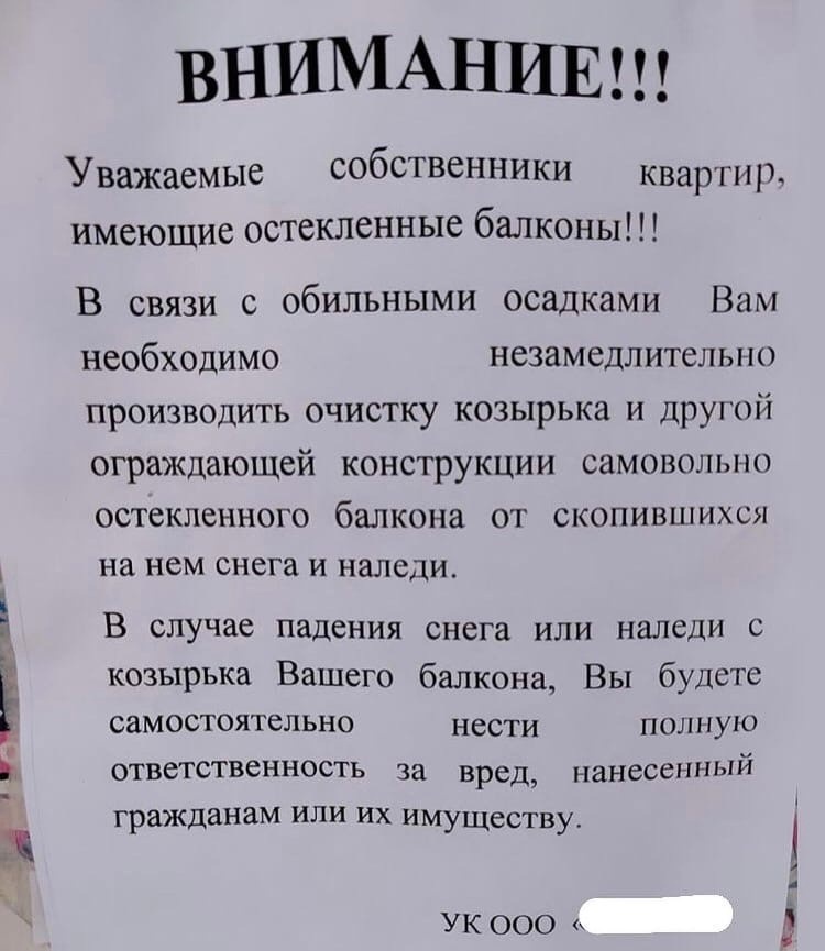Уже видели такое объявление? И правда ли, что снег и сосульки на балконах – проблема исключительно собственников? Давайте разбираться.