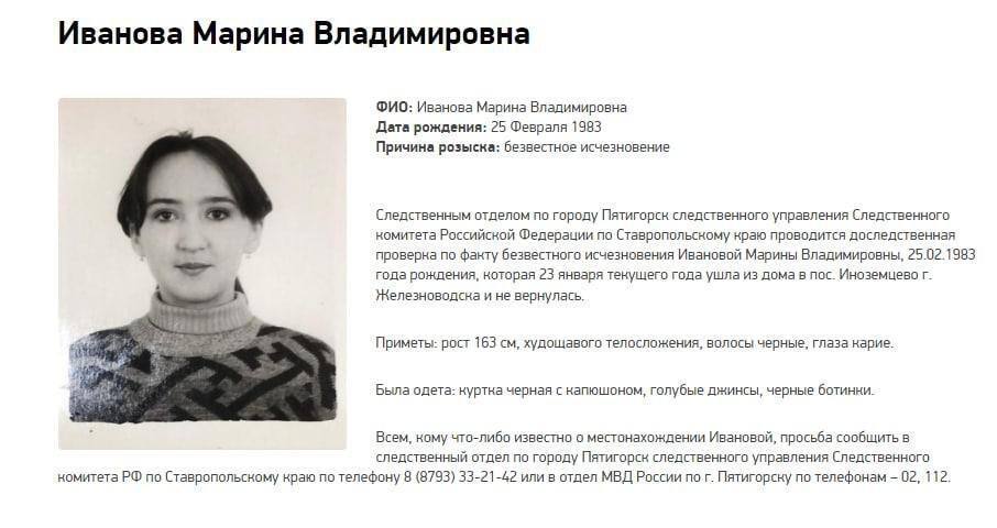 Одновременно уже после пропажи Ивановой 10-ки волонтёров искательского подразделения «ЛизыАлерт» взялись шарить регион вершина мира Бештау также округи местечка Иноземцево, в каком месте Марину представляли завершающий один раз. Из-За время розысков волонтёры миновали наиболее Двесте км, исчезнувшую хотели найти во лесах также во городке, но отпечатков ее никак не обнаружили.