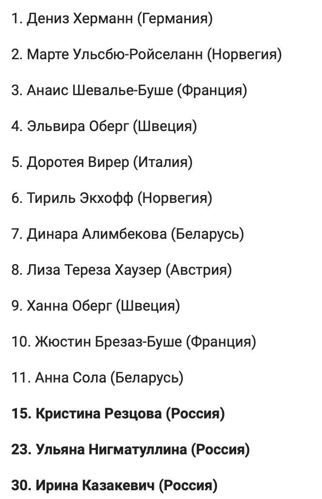 Предварительный старт-лист по Биатлону Женщины Масс-старт 18 февраля 2022