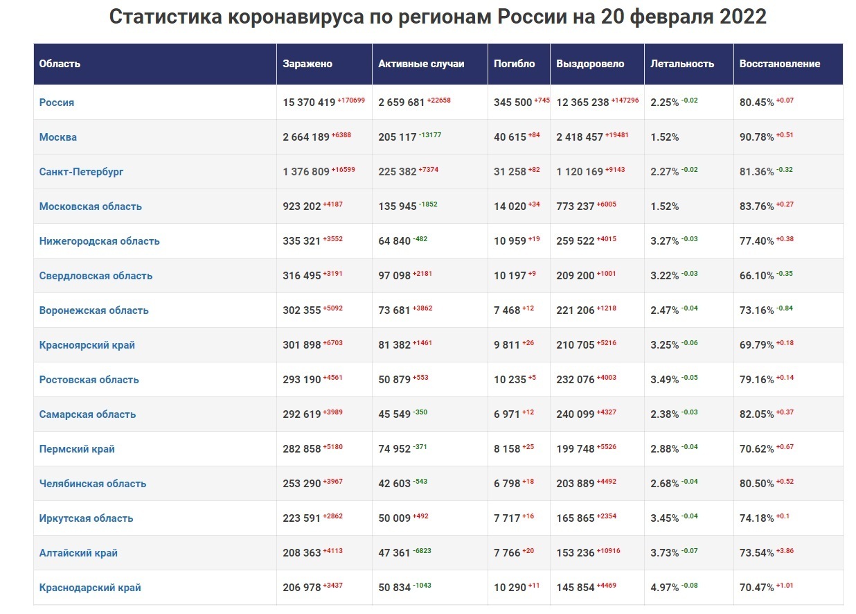 По последним данным статистики оперативного штаба на 20 февраля 2022 в России, лабораторно подтверждено — 15 370 419 случаев заражения коронавирусом COVID-19, из них полностью выздоровели — 12 365 238 пациентов, зафиксировано смертей от коронавируса — 345 500 человек. По официальной статистике коронавируса в России, в период с 19 по 20 февраля 2022 количество заболевших COVID-19 — 170 699, выздоровлений — 147 296, смертей — 745.