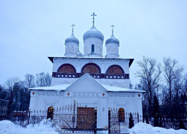 После завтрака, я успел ещё посмотреть Храм Святой Троицы, построенный в XVII веке и перестроенный в XIX в. Он расположен недалеко от гостиницы "Полисть" на ул. Фрунзе. Эта церковь является архитектурным памятником, она действующая. Является образцом большого посадского храма, пятиглавая, с сохранившимися фресками на фасаде.