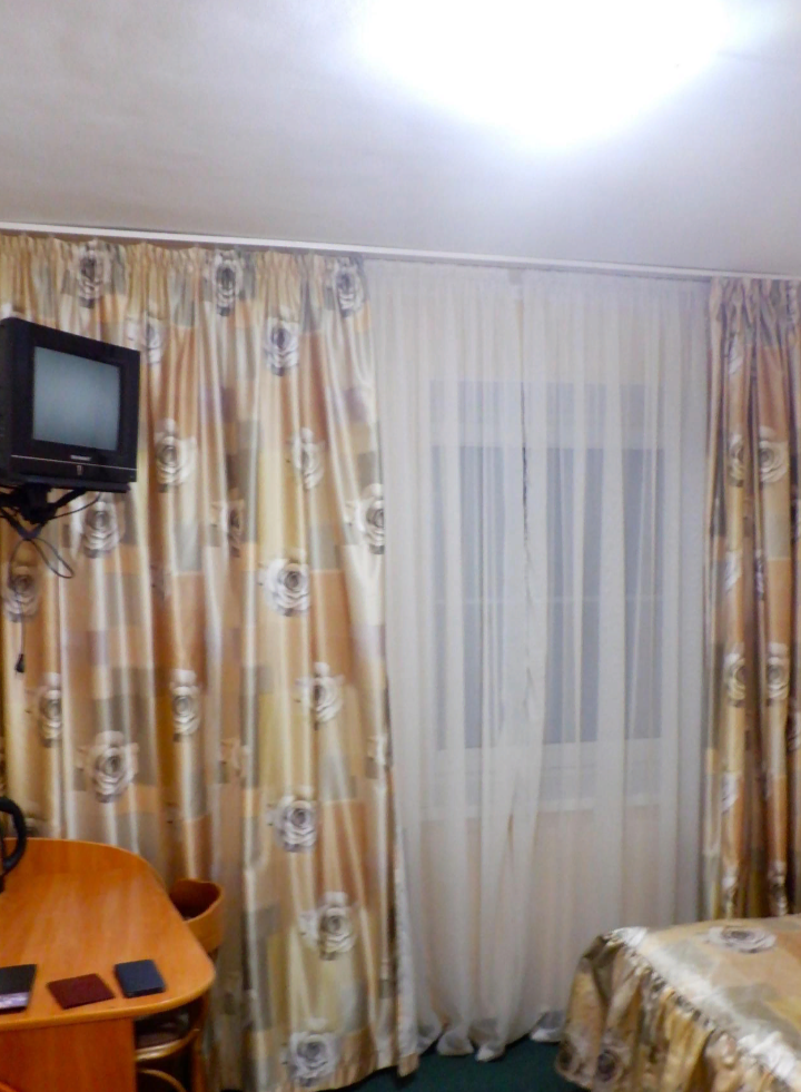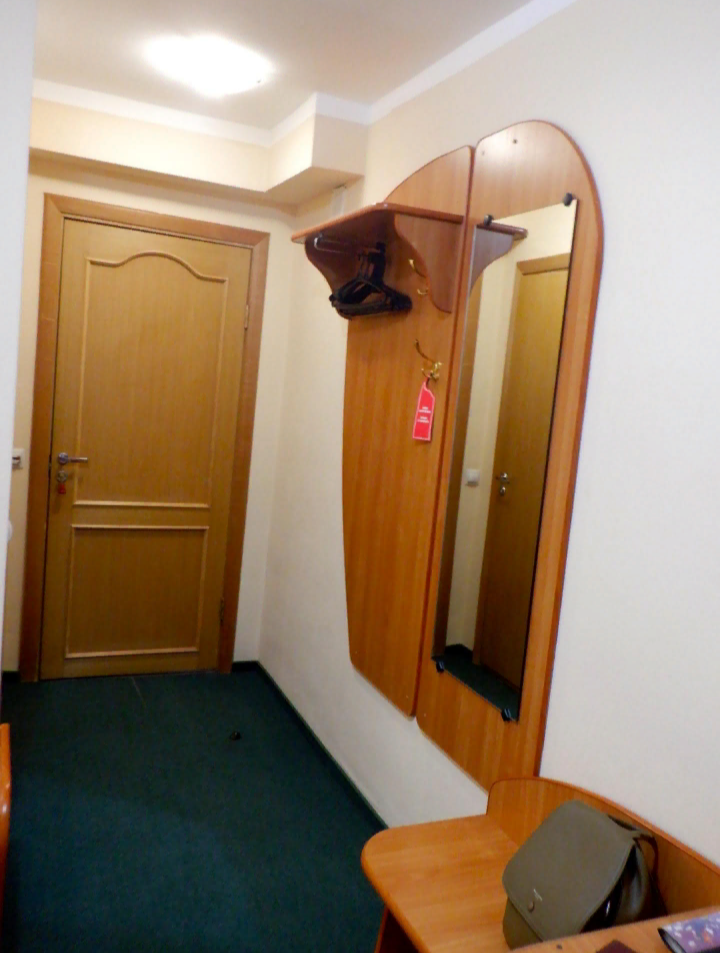 У меня был одноместный номер, он оказался стандартным и небольшим. У двери расположено зеркало и вешалка для одежды, шкафа нет. На кронштейне под потолком старенький телевизор, который работал исправно - я ещё и фильм перед сном посмотрел.