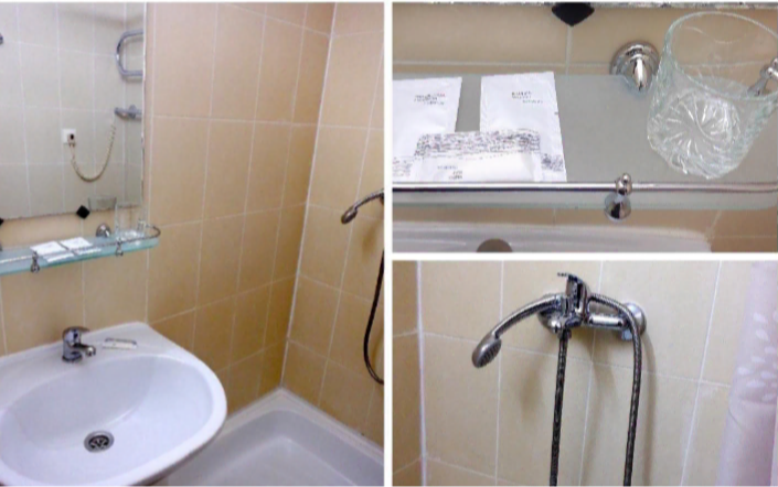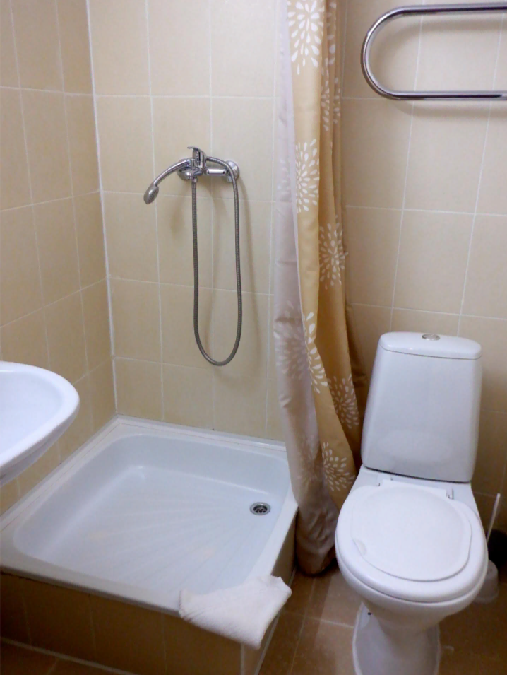 С простой сантехникой, но чистый, даже швы на плитке беленькие, без плесени, как это часто случается. Шторка в душе тоже чистая. Может порадовать то, что вода на пол не льётся, когда я моешься! Поддон в душе чистый, при мытье не забивался. Есть полотенцесушитель, он был горячий всё время.