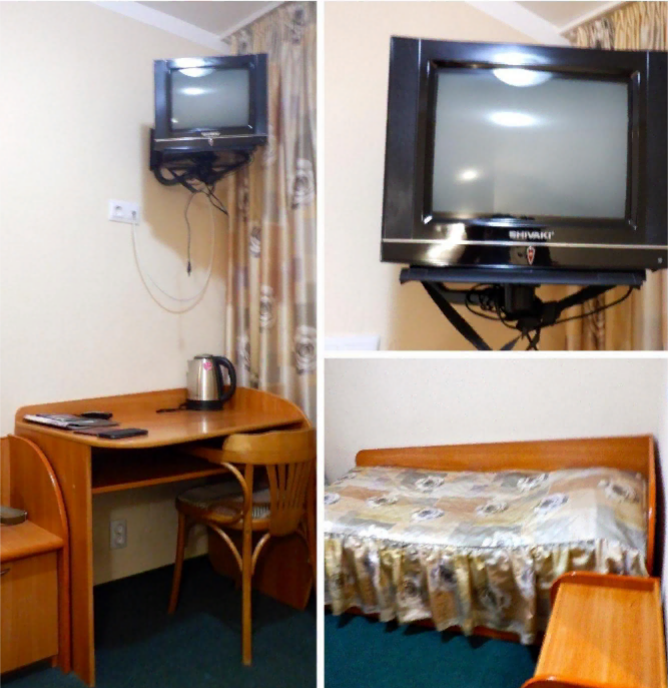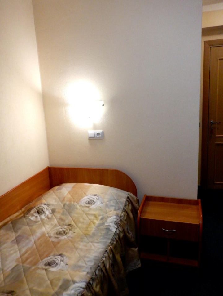 У меня был одноместный номер, он оказался стандартным и небольшим. У двери расположено зеркало и вешалка для одежды, шкафа нет. На кронштейне под потолком старенький телевизор, который работал исправно - я ещё и фильм перед сном посмотрел.