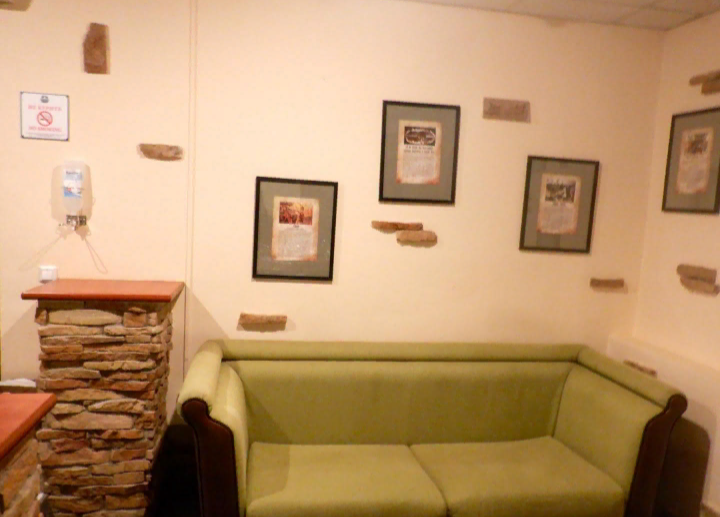 Стены помещения украшены картинами с видами дореволюционной Старой Руссы, с которыми было любопытно ознакомиться. В холле имеется стойка, где можно выпить чай или кофе.
