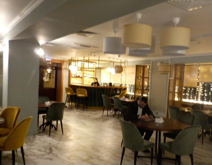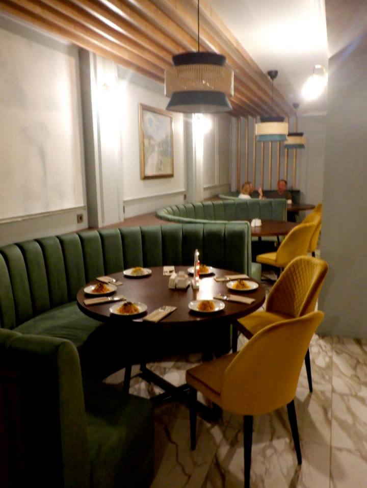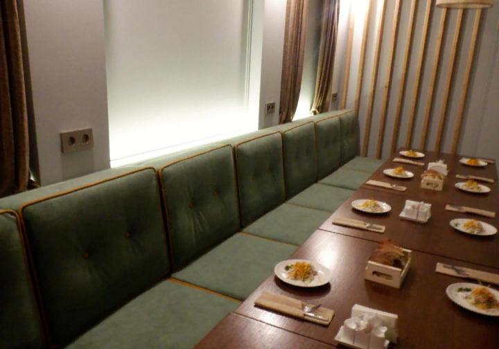 В ресторане столы и места разные, есть и круглые столики с мягкими полукруглыми диванами. Но мы решили, что здесь довольно тесно - столик для шестерых неудобен.