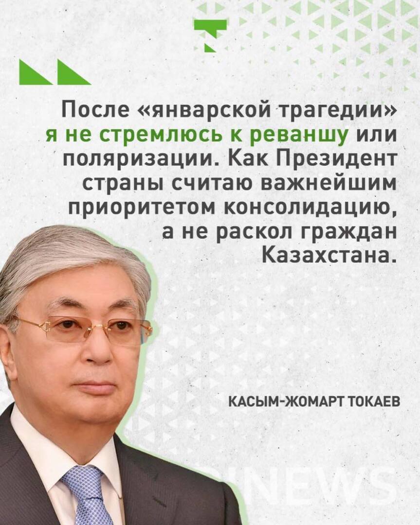 "Впоследствии "январской катастрофы" я не желаю к реваншу или же поляризации. Как Президент государства считаю важным ценностью консолидацию, а не раскол людей Казахстана. В следствие этого я выдвинул теорию Свежего Казахстана, которая призвана освободить от допущенной в минувшем нешуточной несправедливости, не отказываясь при данном от реальных достижений, этих как межэтническое единодушие и многовекторная наружная политика".