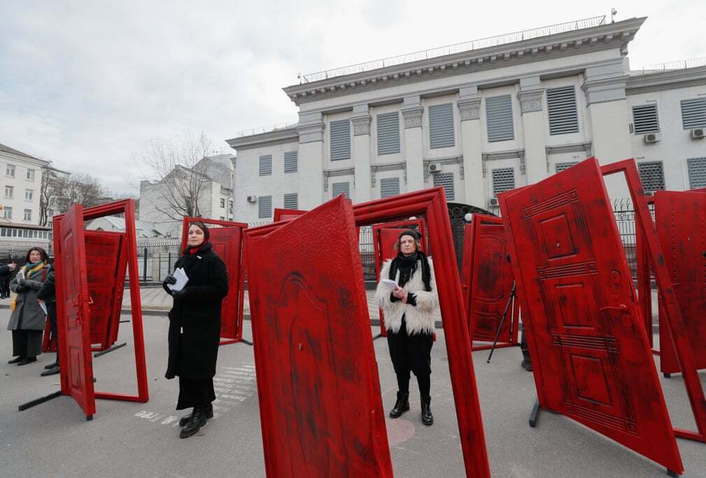 Киев, Украина Активисты выступают перед посольством России. Установлены 11 сломанных дверей как символ 11 сломанных жизней гражданских журналистов и крымских татар. Более сотни активистов и крымских татар были задержаны российскими властями за их гражданскую позицию с момента аннексии Крыма в 2014 году.