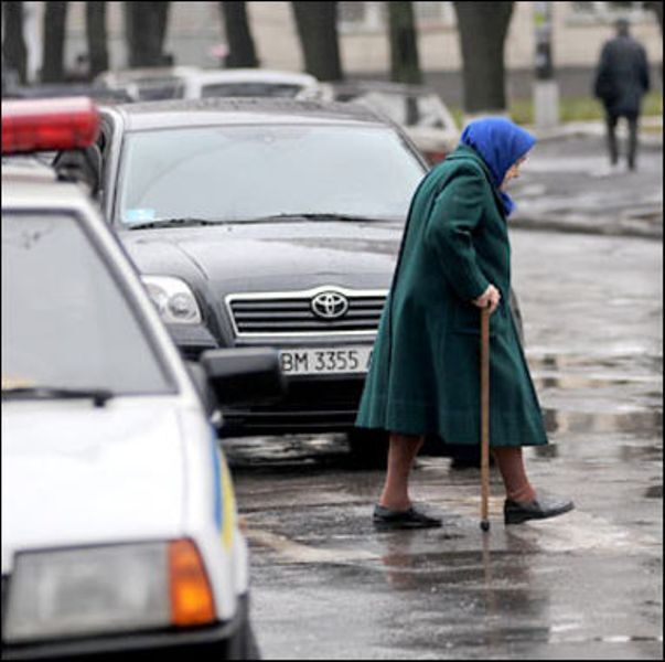 Вдруг откуда ни возьмись старушка. Не обращая внимания на оклики стоящих людей и пронзительные сигналы автомобилистов, бодро пошагала через дорогу…