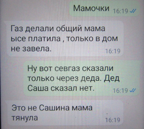 Спустя какое-то время звонит наш отец и я слышу в трубке невероятнейший скандал. Кричат сосед и соседка. Что никакого разрешения на подключение газа они не дадут. И от кадастра тоже отказываются. Ничего не дадут. Не покажут, не пустят, не откроют!