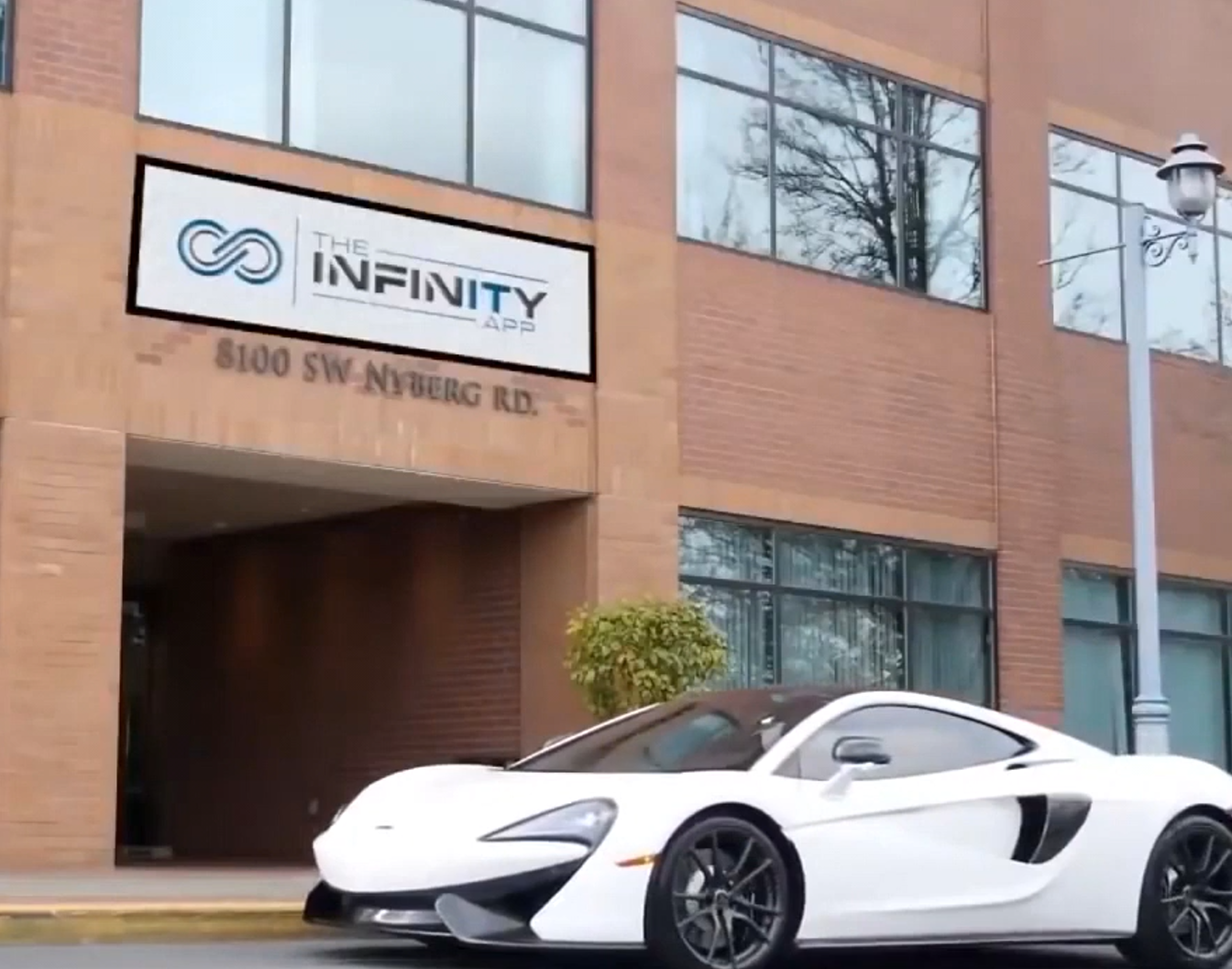Абсолютно то же самое – некое приложение Infinity App, снятое вроде бы на Западе, но на деле тоже такое же жульничество. В видеоролике с данным разводом «директор» Infinity App, некий Марк Стивенсон, едет на подчёркнуто дорогой спортивной машине (в которой опознаётся «МакЛарен») до некоего здания в Голливуде, на фронтальной части здания которого красуется прилепленный в редакторе логотип приложения.