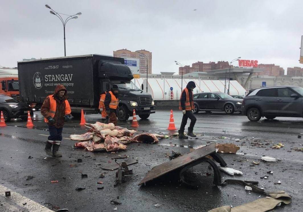 В районе развязки с Каширским шоссе грузовик, перевозивший туши коровы, попал в серьезное ДТП: все содержимое выпало на дорогу. Информации о пострадавших людях пока нет.