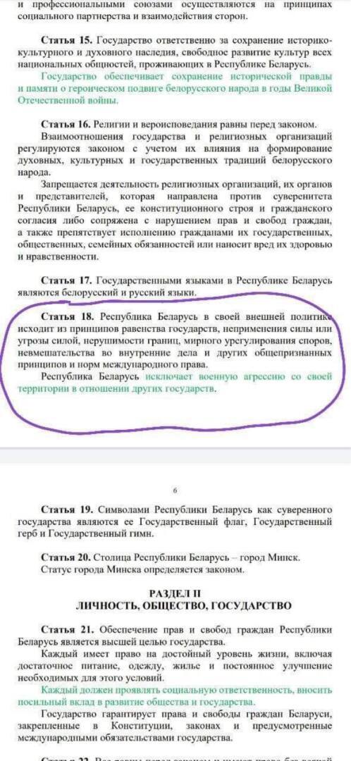 А именно - статья 18, которая дополнена тем, что Беларусь исключает военную агрессию со своей территории в отношении других государств.