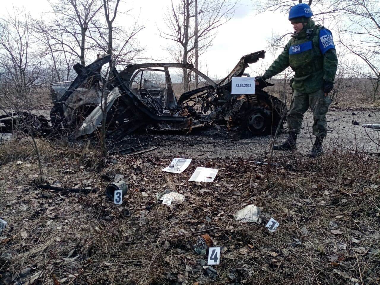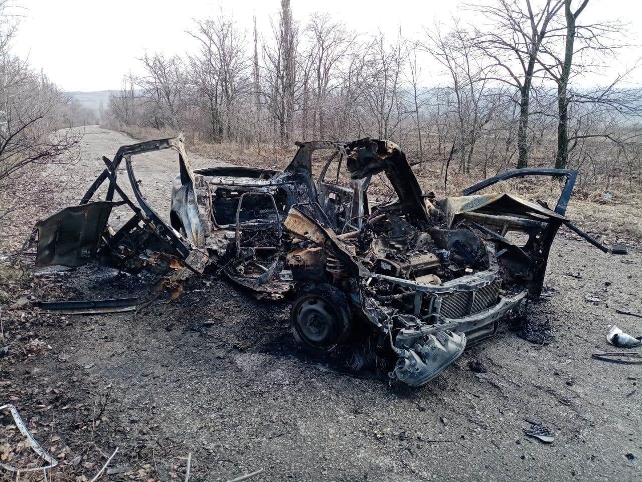 Представительство ЛНР в СЦКК публикует фото с места обстрела украинскими силовиками автомобиля, в результате которого погибли двое мирных жителей в районе н.п. Березовское