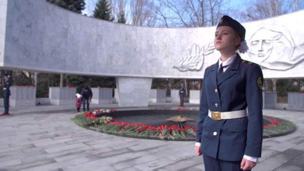 На городском мемориале Второй мировой войны посетители возлагают красные гвоздики к вечному огню и делятся с нами некоторыми своими мыслями о ситуации в Украине.