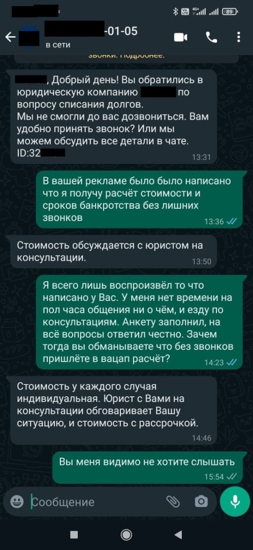 Привлек заголовок: «Рассчитайте стоимость банкротства прямо сейчас без лишних звонков и сообщений». Оставила заявку с личного телефона от мужского имени. Проходит минута и пошли звонки с московских номеров, после трёх пропущенных, мне написали в Whatsapp. Переписку прикладываю. Неужели такая навязчивая реклама работает и люди ведутся на халяву и бесплатное банкротство?
