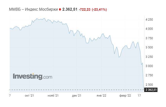 Индекс Мосбиржи ниже 2400 пунктов впервые с марта 2020.