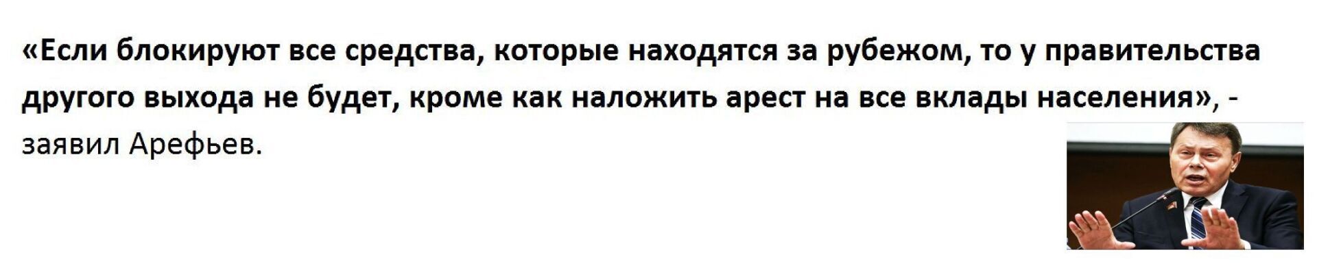 Подлый Запад может блокировать все средства находящиеся за рубежом, а в ответ Правительство России может наложить арест на вклады населения. Об этом предупредил народ депутат Государственной Думы от КПРФ Николай Арефьев.